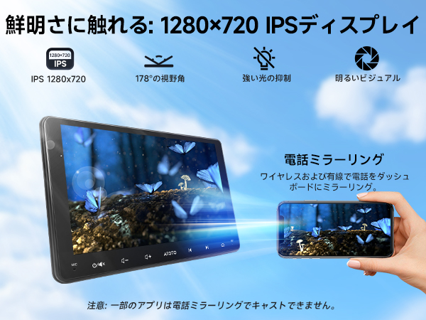 · 9インチIPS アンドロイドナビ: 178°の広視野角とリアルな色彩を誇る9インチIPSディスプレイ(1280×720)で、鮮やかなビジュアルを体験!電話ミラーリング(一部の非CPAAアプリも対応)や分割画面機能で、デュアルアプリをスムーズに管理可能