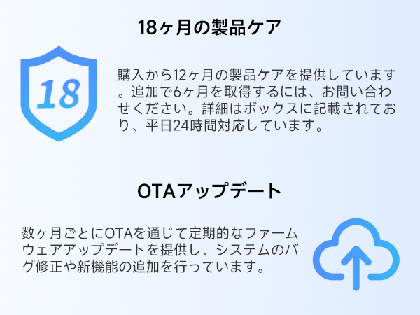 · 製品ケア: ご購入日から12-ヶげつ間のサポートが提供されます。条件を満たすユーザーは、さらに6ヶげつの延長サポートをご利用いただけます。詳細は同梱の説明書をご確認ください。ヘルプデスクは平日に対応しており、サポート情報については、包装内の多言語対応オンラインマニュアルをご参照ください
