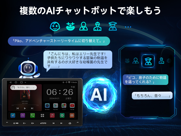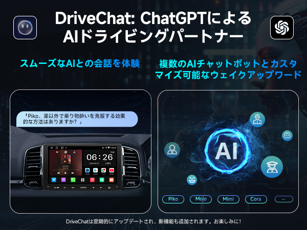 · Drivechat AI-Androidナビ: ChatGPT搭載で多彩なインタラクションが楽しめる専用アプリ。チャットボットを切り替えて、体験を自由にカスタマイズ。目覚ましの言葉をカスタマイズして、あなたのスタイルを反映させましょう