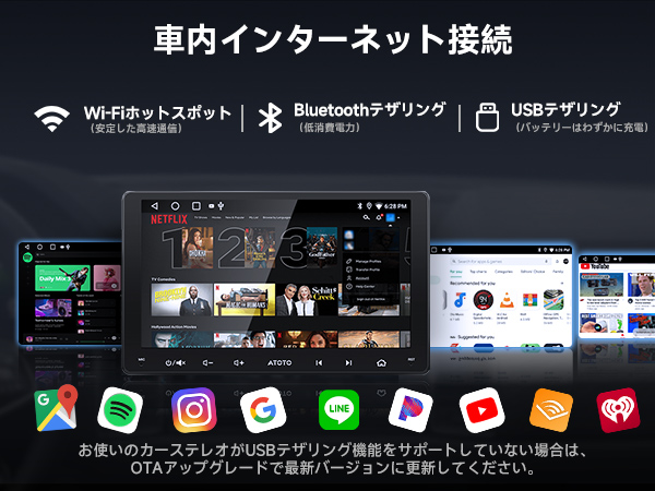 · インターネット接続オプション: Wi-Fiホットスポット、Bluetoothテザリング、またはUSBテザリングからお好みの方法を選択してインターネットに接続できます。快適なスマートドライビング体験を楽しみ、シームレスなインターネット接続でOTA(無線)アップデートを受け取りましょう